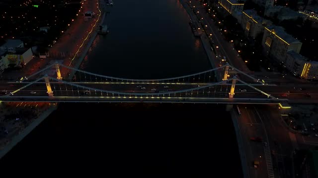 Moscow River and Bridge Aerial Night View From Drone