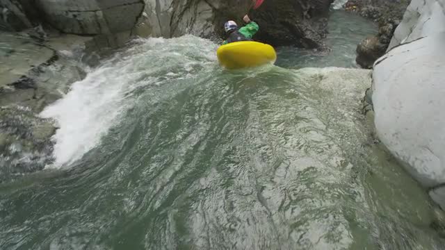high level drone shot coming down as a crew of white water rafters cruise through rapids on a river in the cascade mountains.