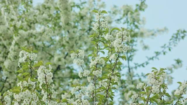 Tree branches in blossom against a blue sky background. Close-up shot. Soft focus