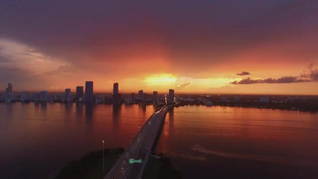 Drone Shot flying along the freeway towards sunset in Miami Beach. Shot at the Julia Tuttle Causeway in 24fps 4k with Phantom 4 Pro