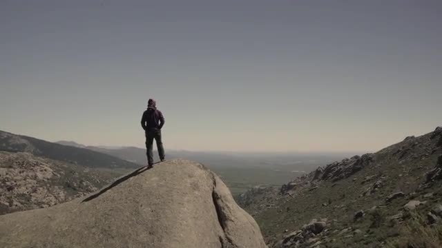 Tracking shot of woman hiking in the mountains.