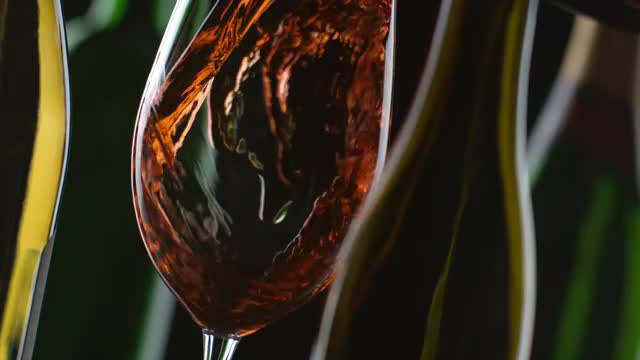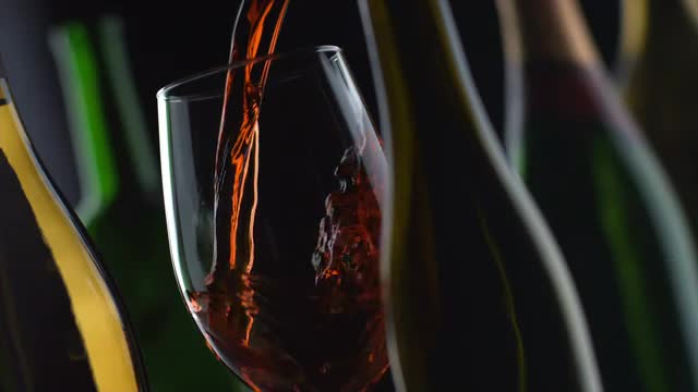 372389 - Slow motion shot of red wine pouring with bottles and black background; shot on Phantom Flex 4K at 1