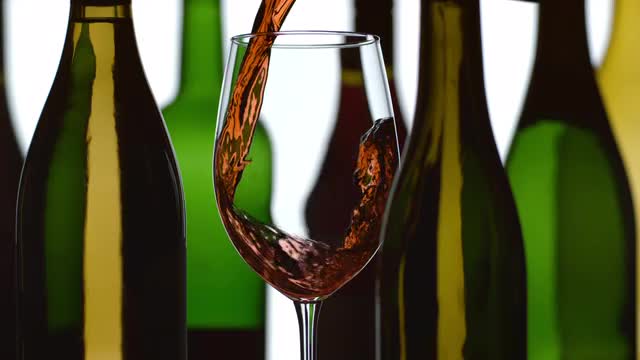 Pouring red wine into glass slow motion.