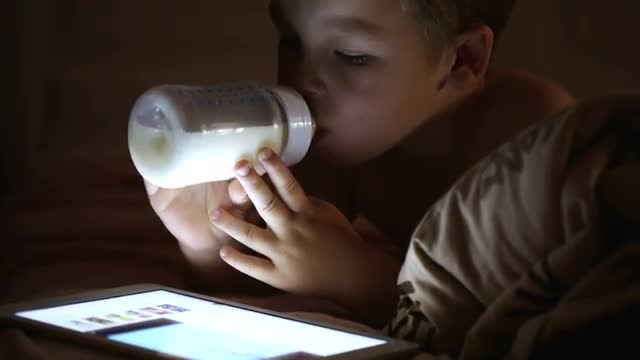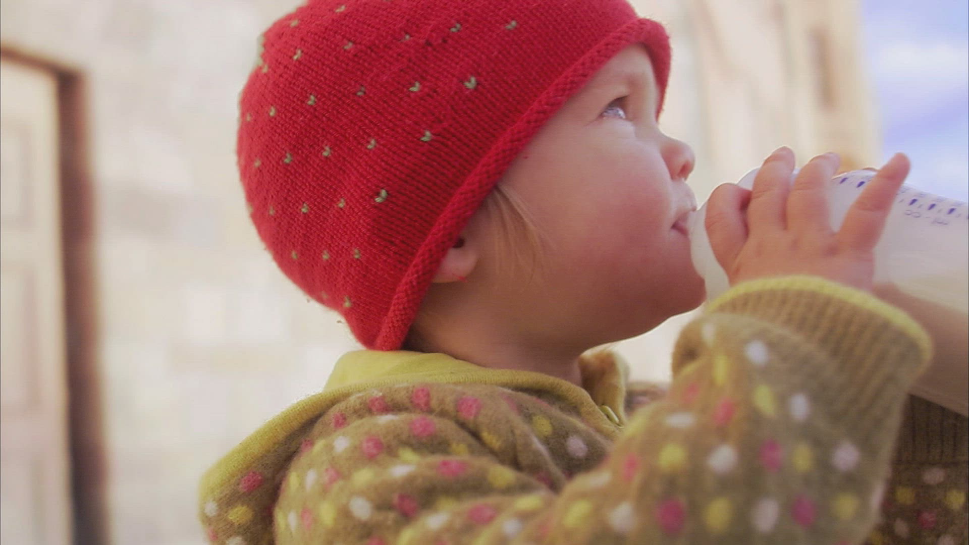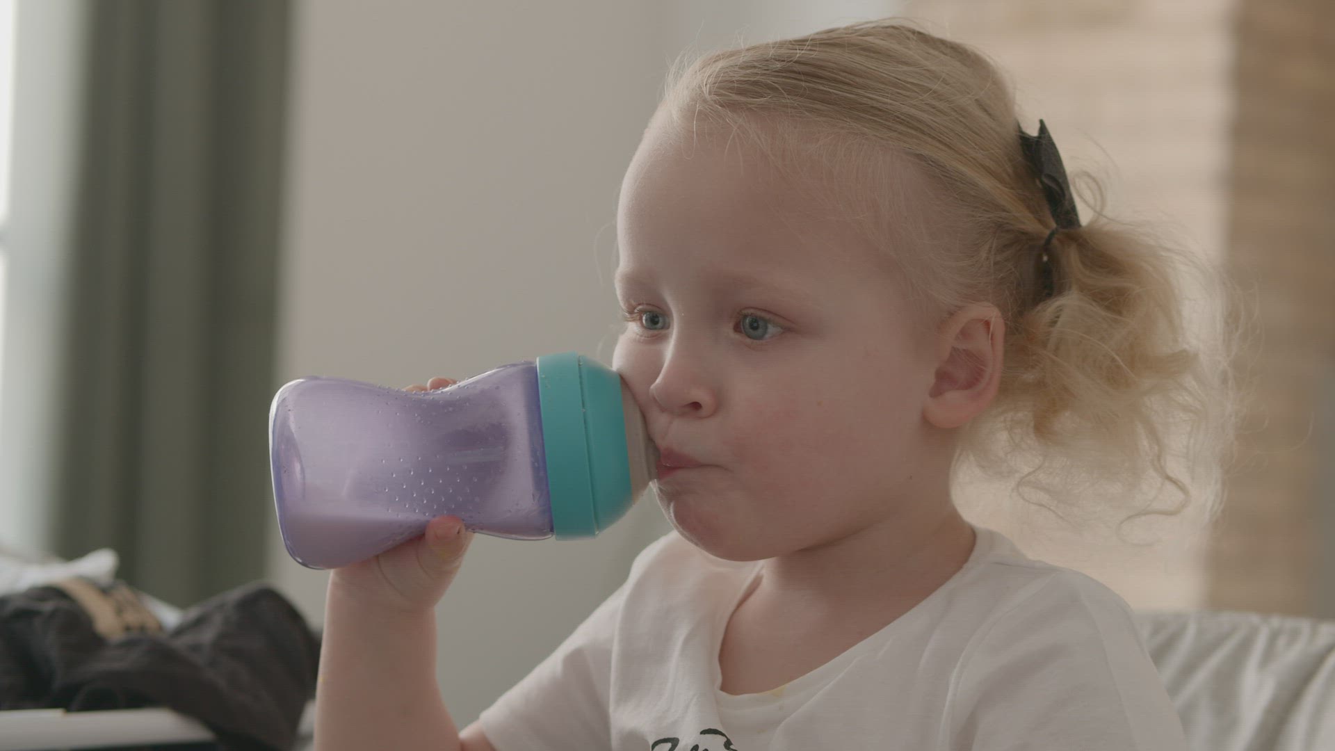 Three Children sitting drinking fruit drink from bottle with straw