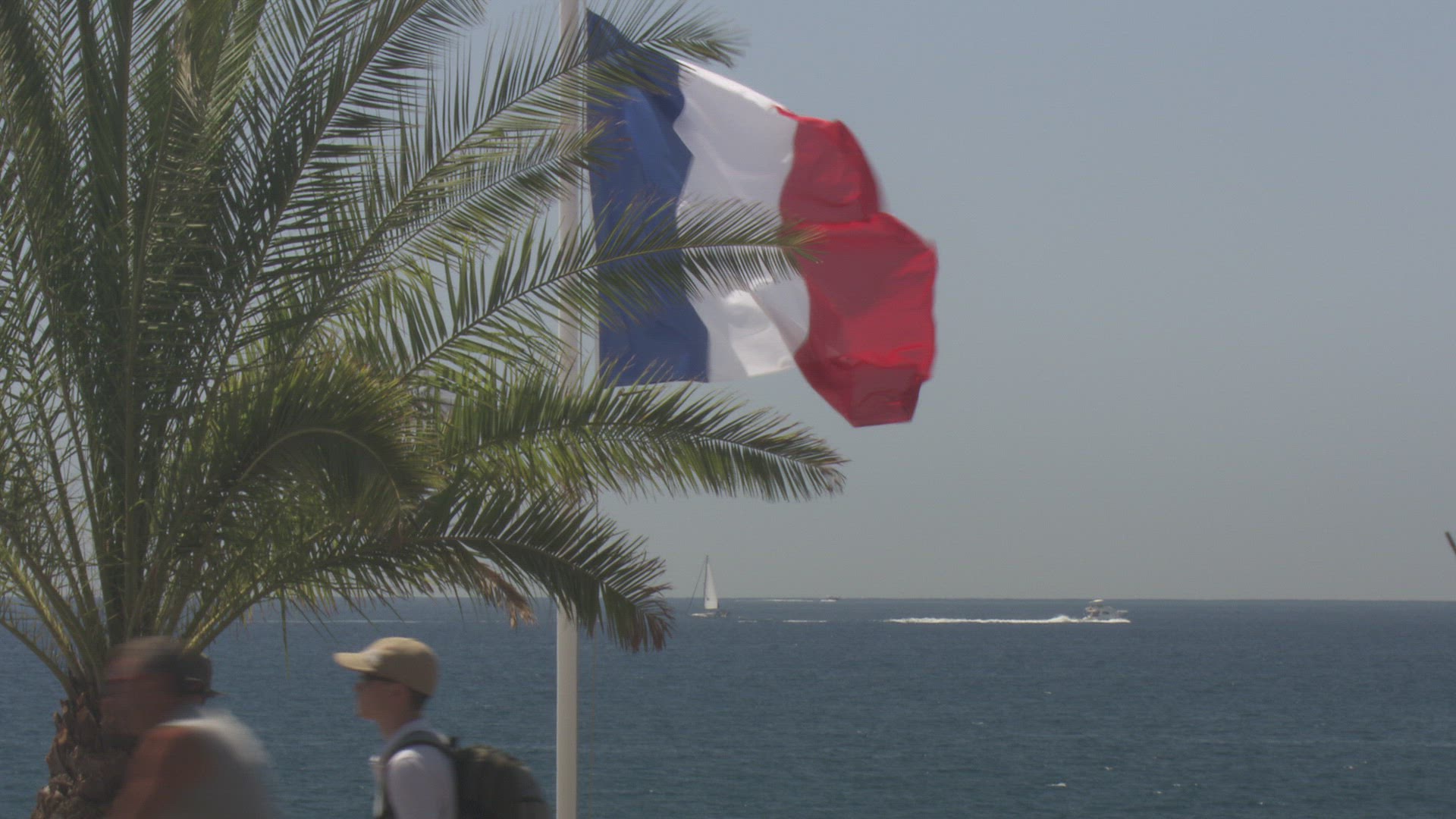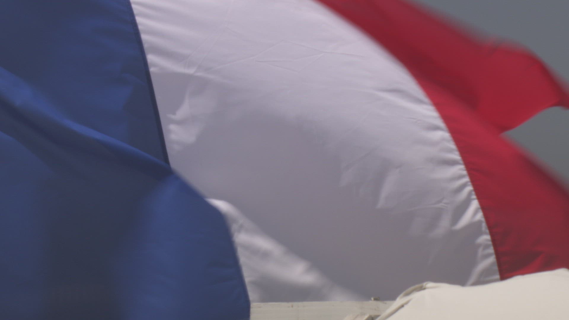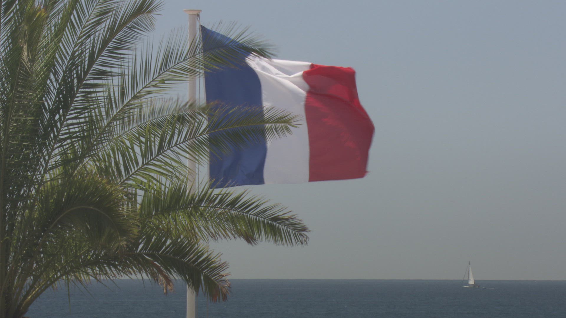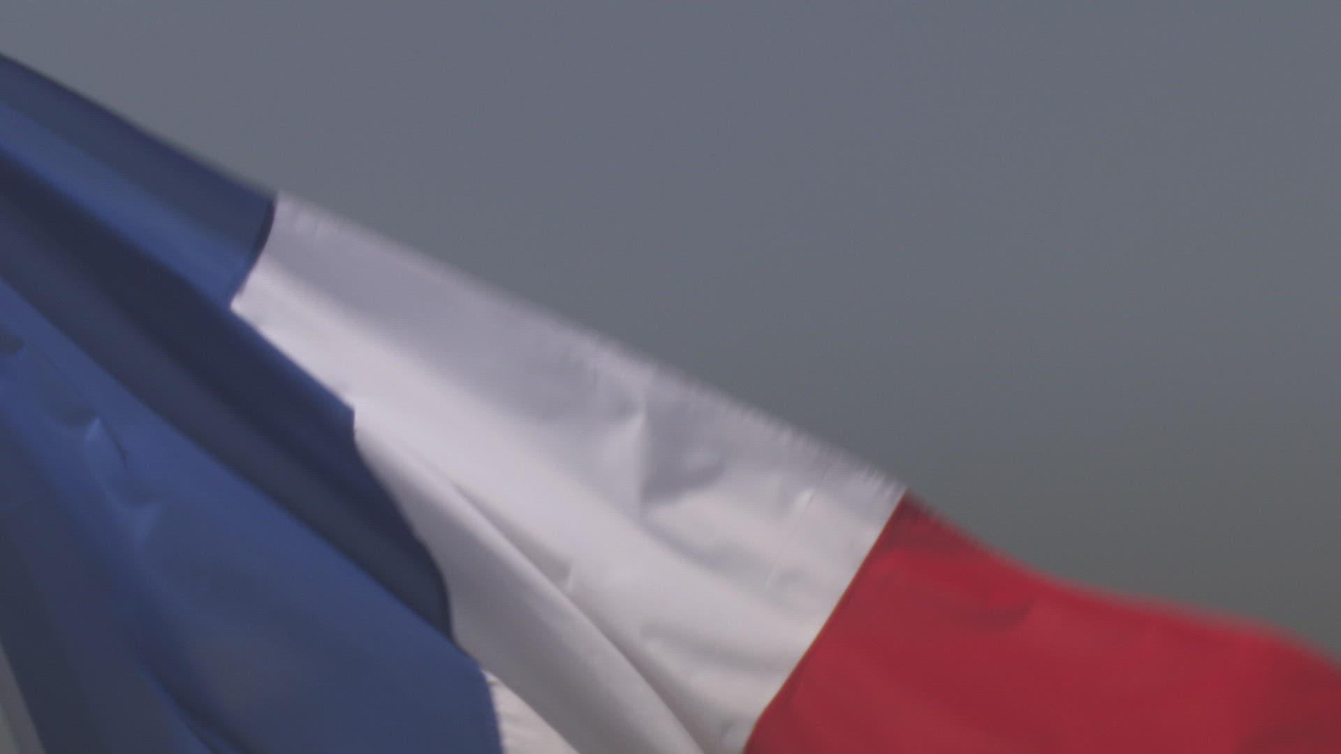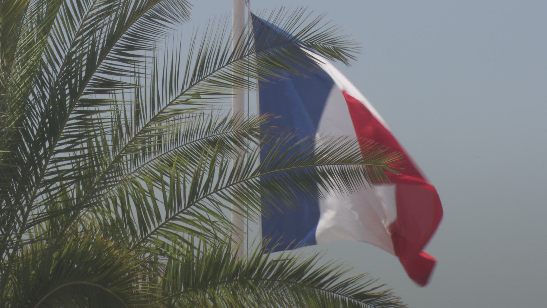 A French flag flutters in the wind.