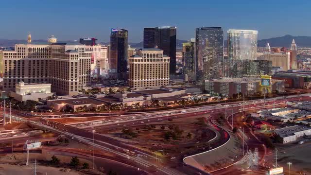 772024 - Zoom out, panning shot of the Las Vegas skyline and freeway transition from day to night.