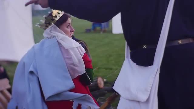 Opole/poland - Apr 30 2017: Peasants and Priests Gathered For a Big Council. a Queen Has Come on the Council. She, With an Expression of Disgust on Her Face, Listens a Priests Stories. All of Them Are Under an Open Sky on a Spacious Green Wide Glade. Video in a Super Slow-Motion Mode. International Knights Tournament in Opole (Poland).
