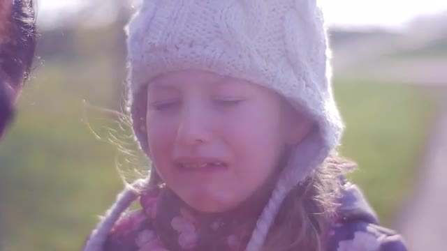 Child Abuse. a Young Mother Hit Her Little Daughter. the Girl Cries and is Afraid to Look at a Video Camera. She Lowers Her Eyes. Sunlight Shines Directly Into the Camcorder. Video in a Super Slow-Motion Mode.