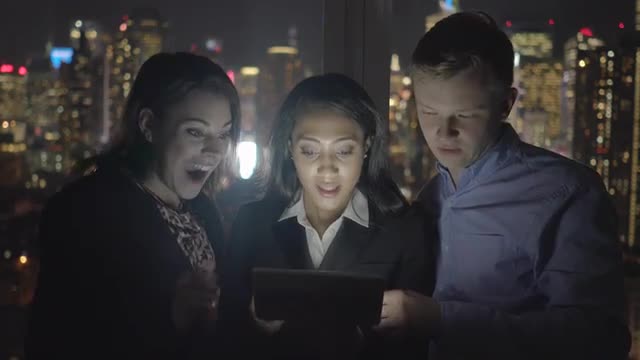 787289 - group of friends watching tv on tablet pc in the city. urban lifestyle people