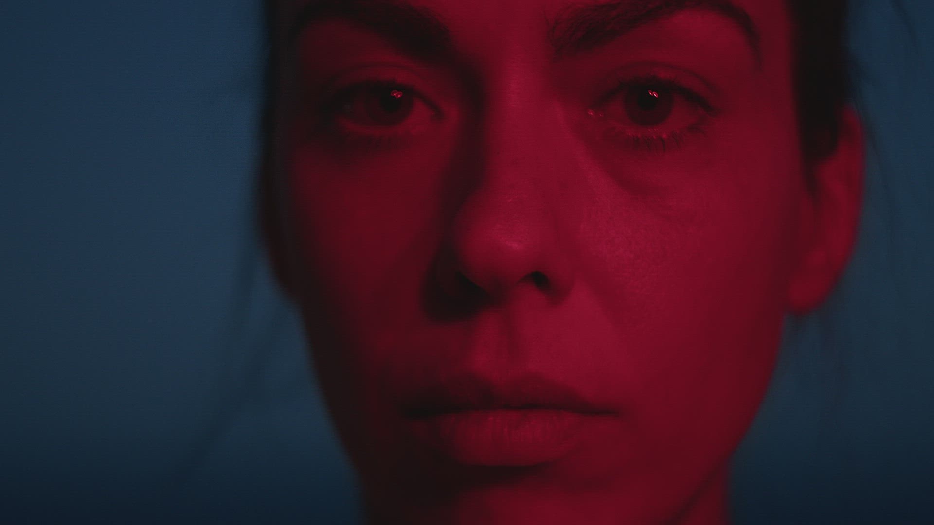 2131784 - Extreme close-up of woman looking at camera illuminated in red over blue sky