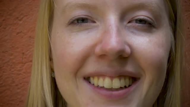 807604 - Extreme close up portrait of a young woman smiling at the camera