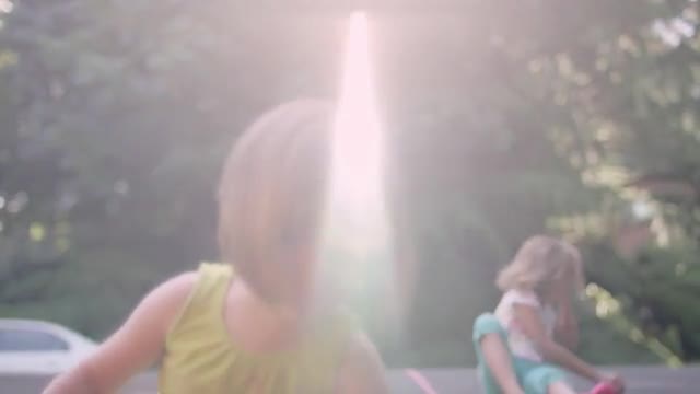 Sisters drawing on pavement with chalk