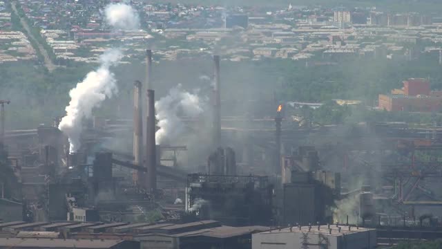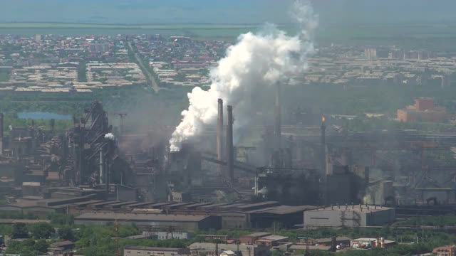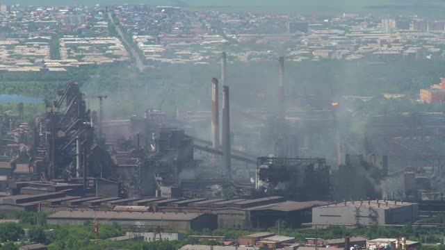 Pollution of the City by Emissions of Industrial Enterprise Timlamps.summer Sunny Day. Panorama of a Large Metallurgical Plant Against the Background of Urban Buildings. Emissions of Smoke Cover the View of the City.