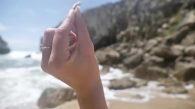 A girls hand, holding a seashell. Slowmotion footage in 4k quality.