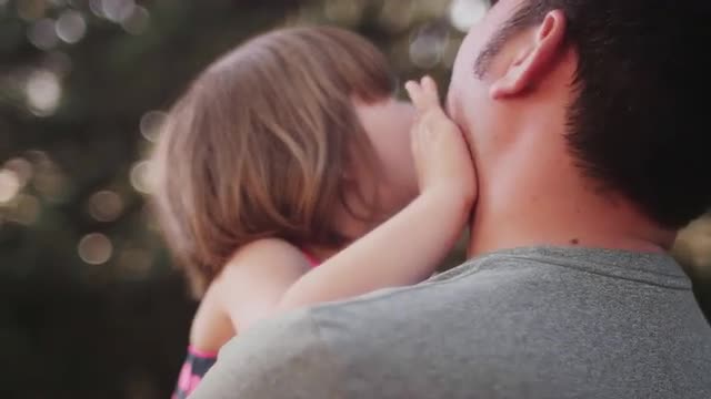 > A father holding his daughter outside