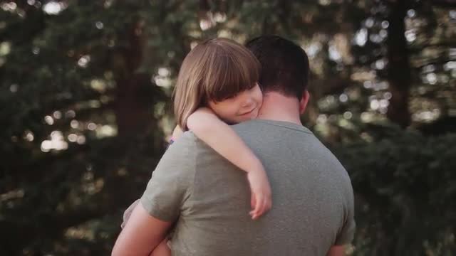 > A father holding his daughter outside