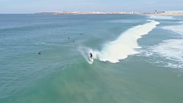 Aerial footage of a surfer surfing a perfect wave in Portugal. 4k quality in slowmotion.