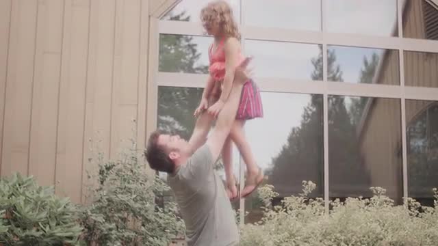 A father tosses his daughter up in the air and catches her
