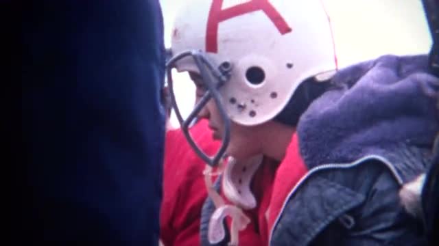 Handheld shot of a high school game in a stadium in the 1970's.