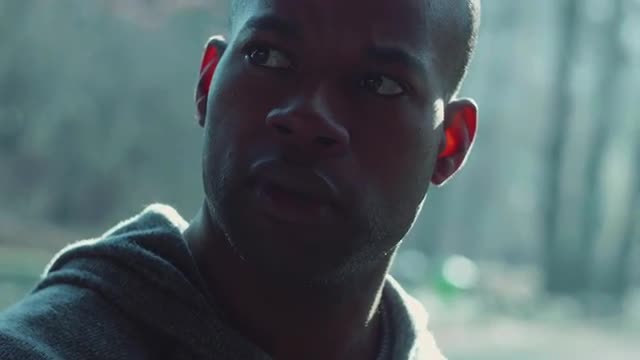 > Zooming shot of a muscular black man wiping the sweat off his forehead on a foggy dark background