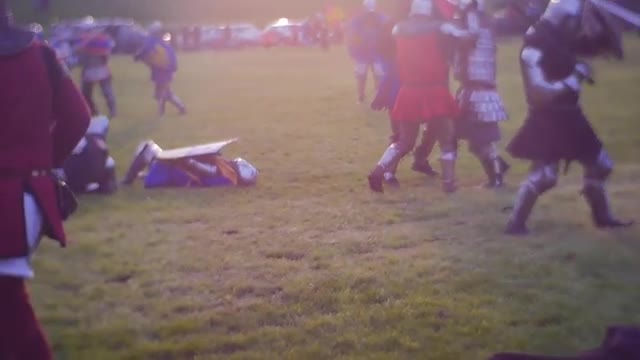 a Knights Are Preparing For a Start of a Tournament. They do a Little Workout Before the Fight. They Check Their Swords and Armor For Durability. Other Knights Just Stand and Look at Them. the Knights Are on a Wide Green Field. Video in a Super Slow-Motion Mode.