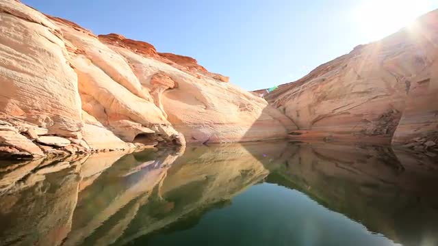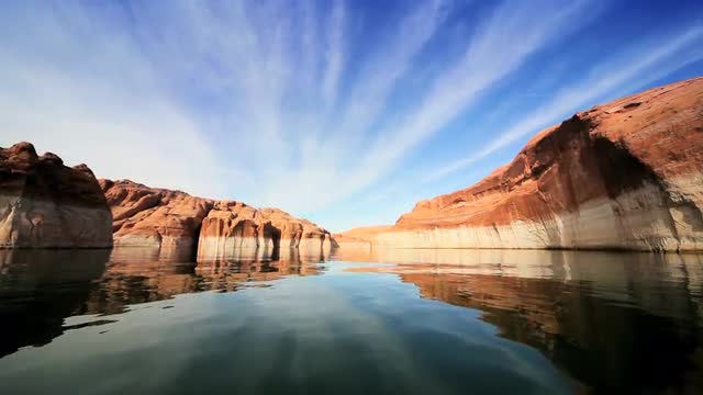 A stunning aerial view of a car driving into the sunset at Glen Canyon. Utah USA. Lake Powell is a reservoir on the Colorado River, straddling the border between Utah and Arizona. It is a major vacation spot that around two million people visit every year.