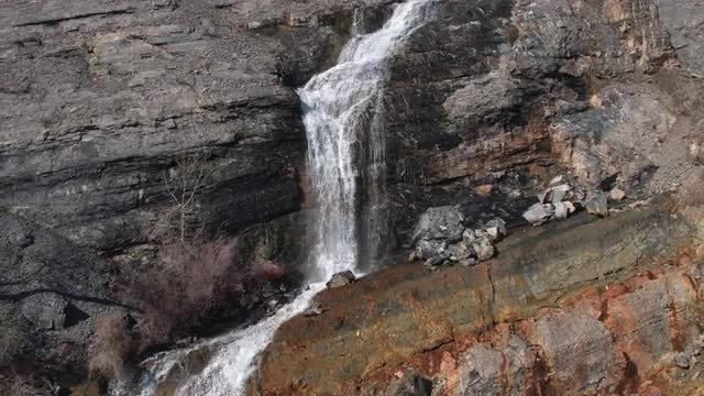 780251 - Slow rise looking up at waterfall flowing down rocky mountain side