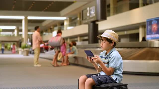 Smiling girl riding travolator at airport with family