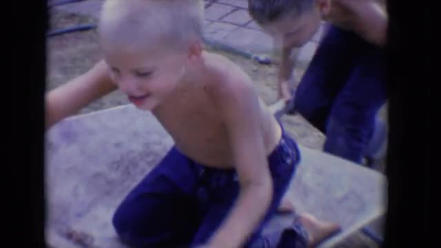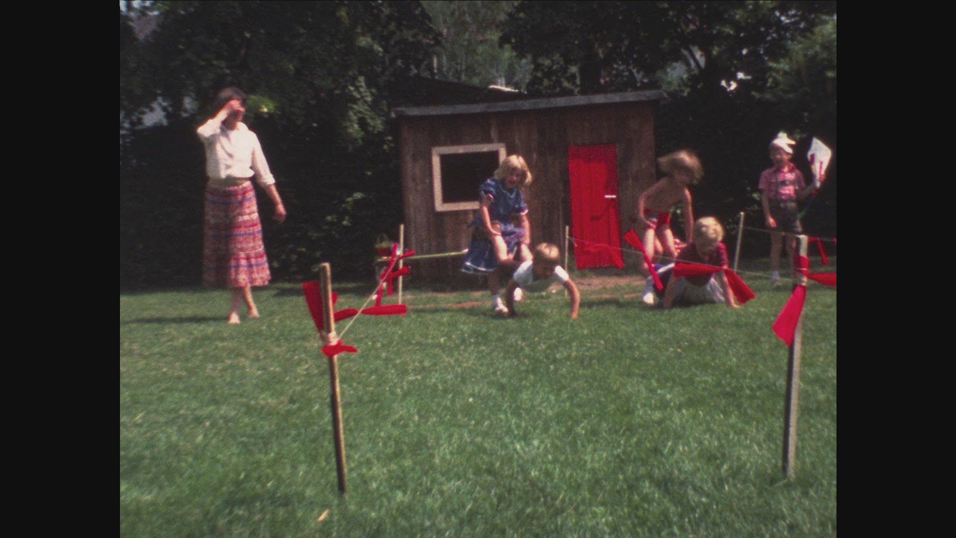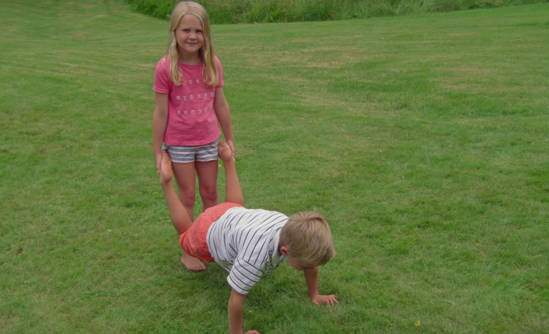 girl and boy playing wheelbarrow on lawn in Sweden