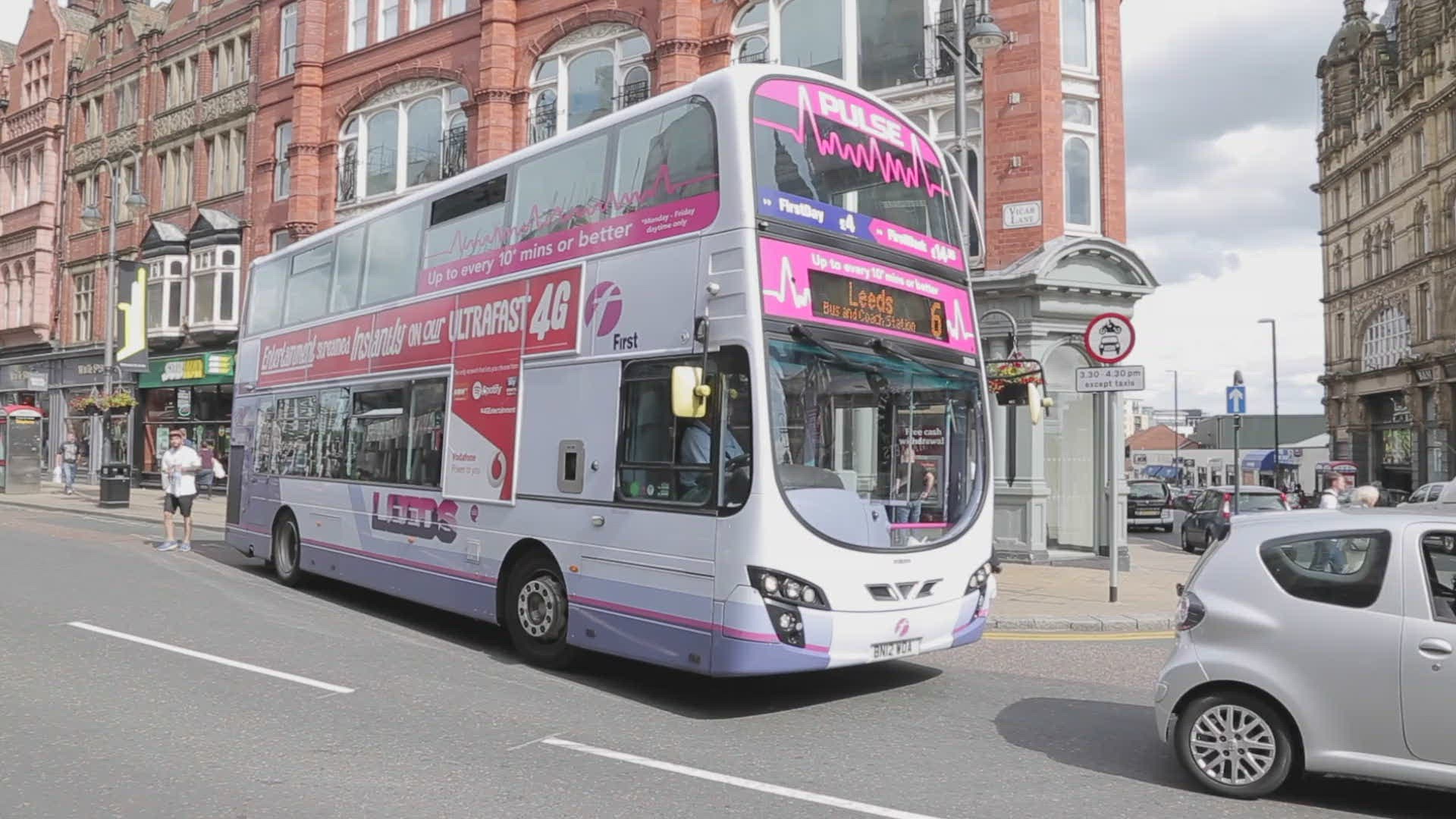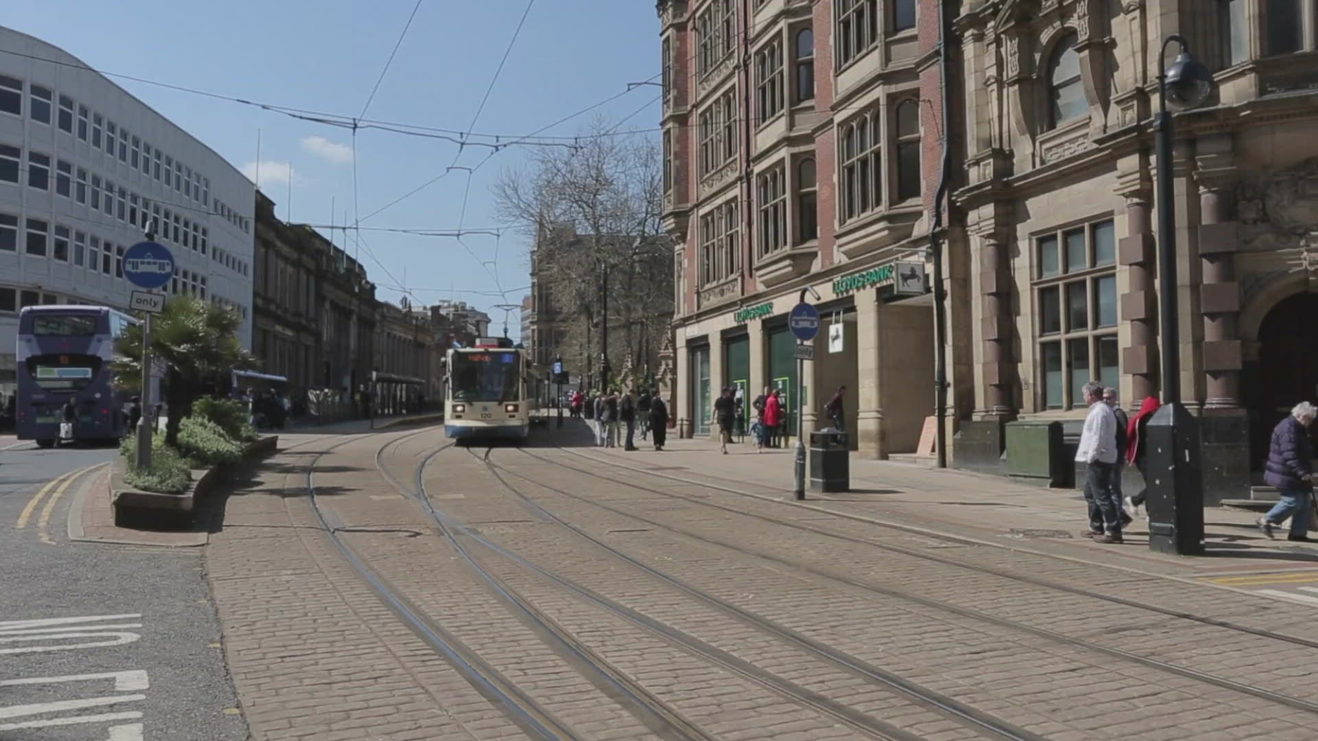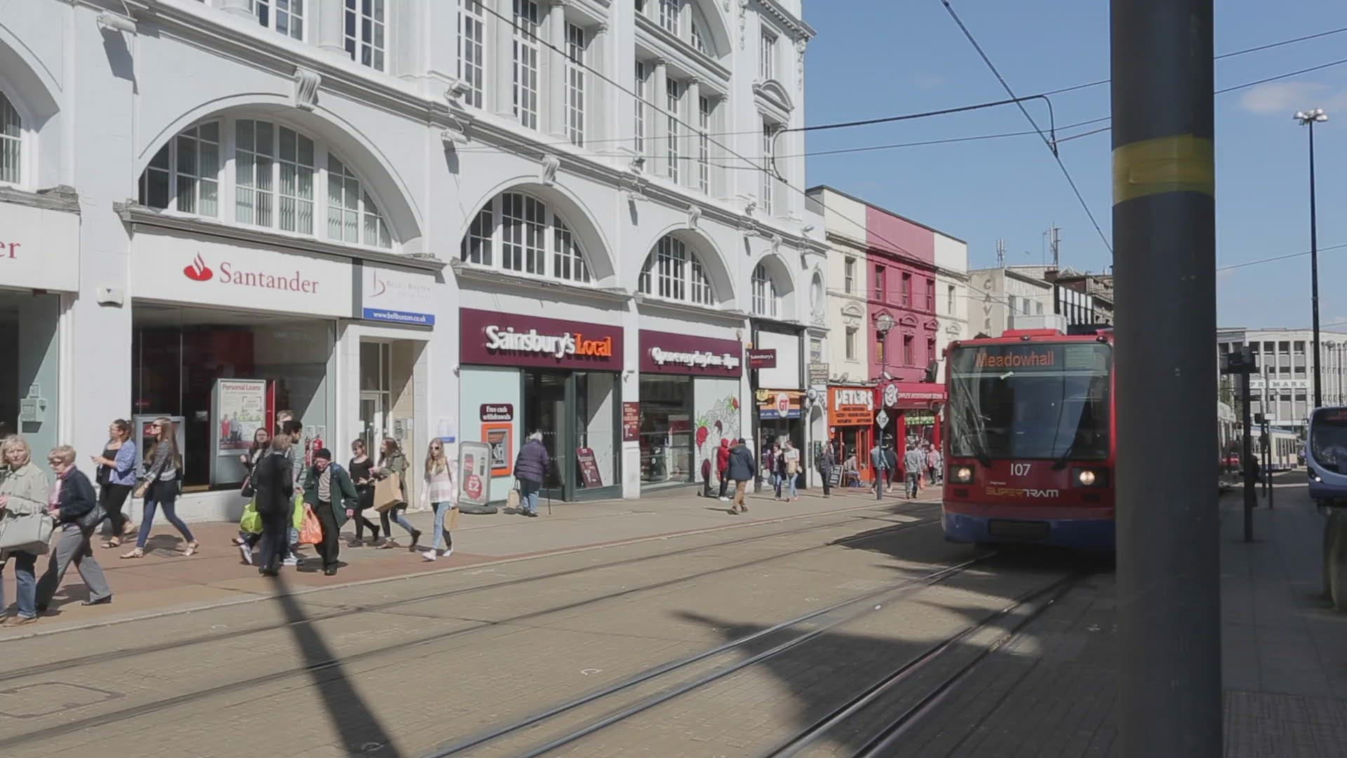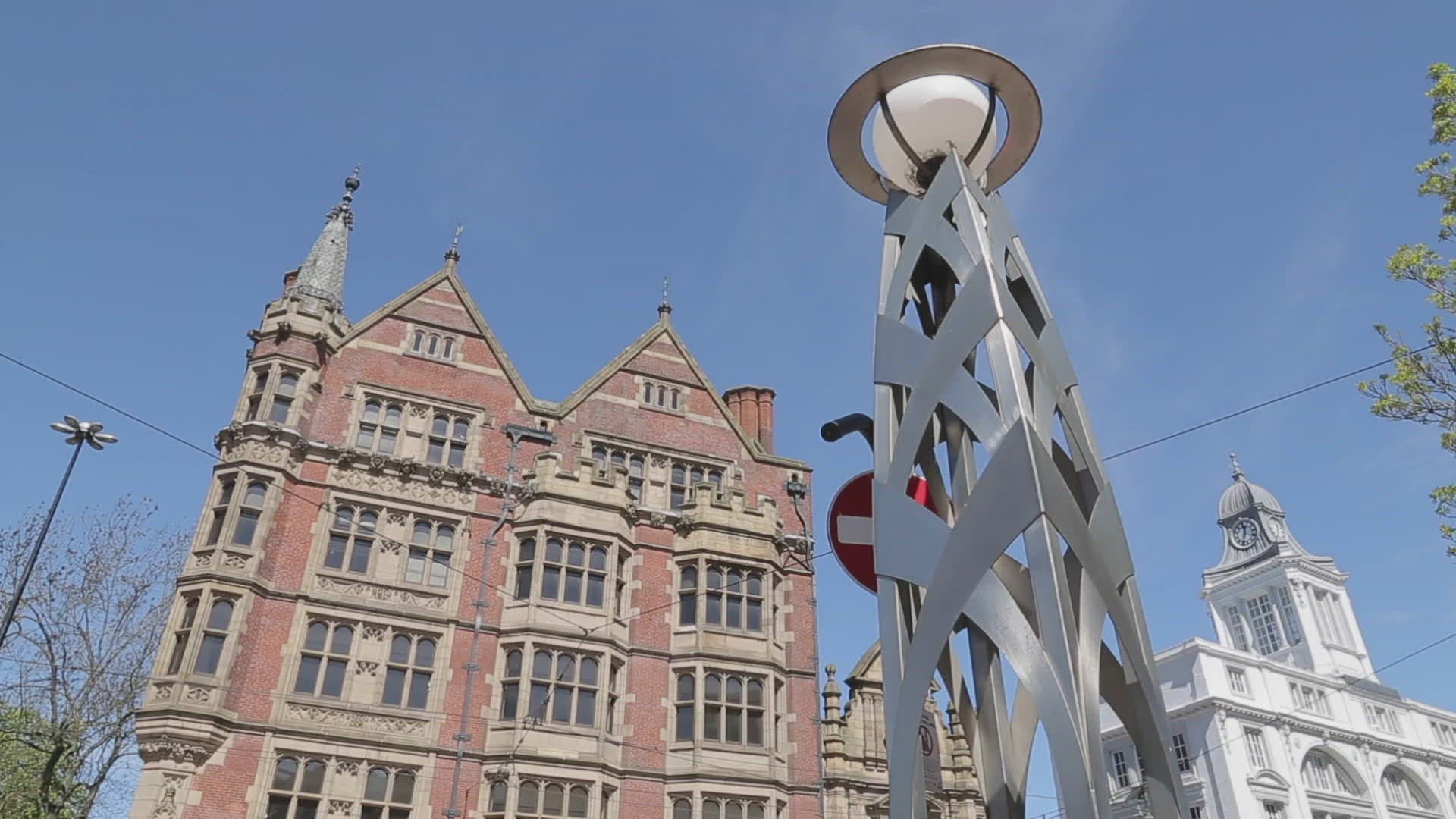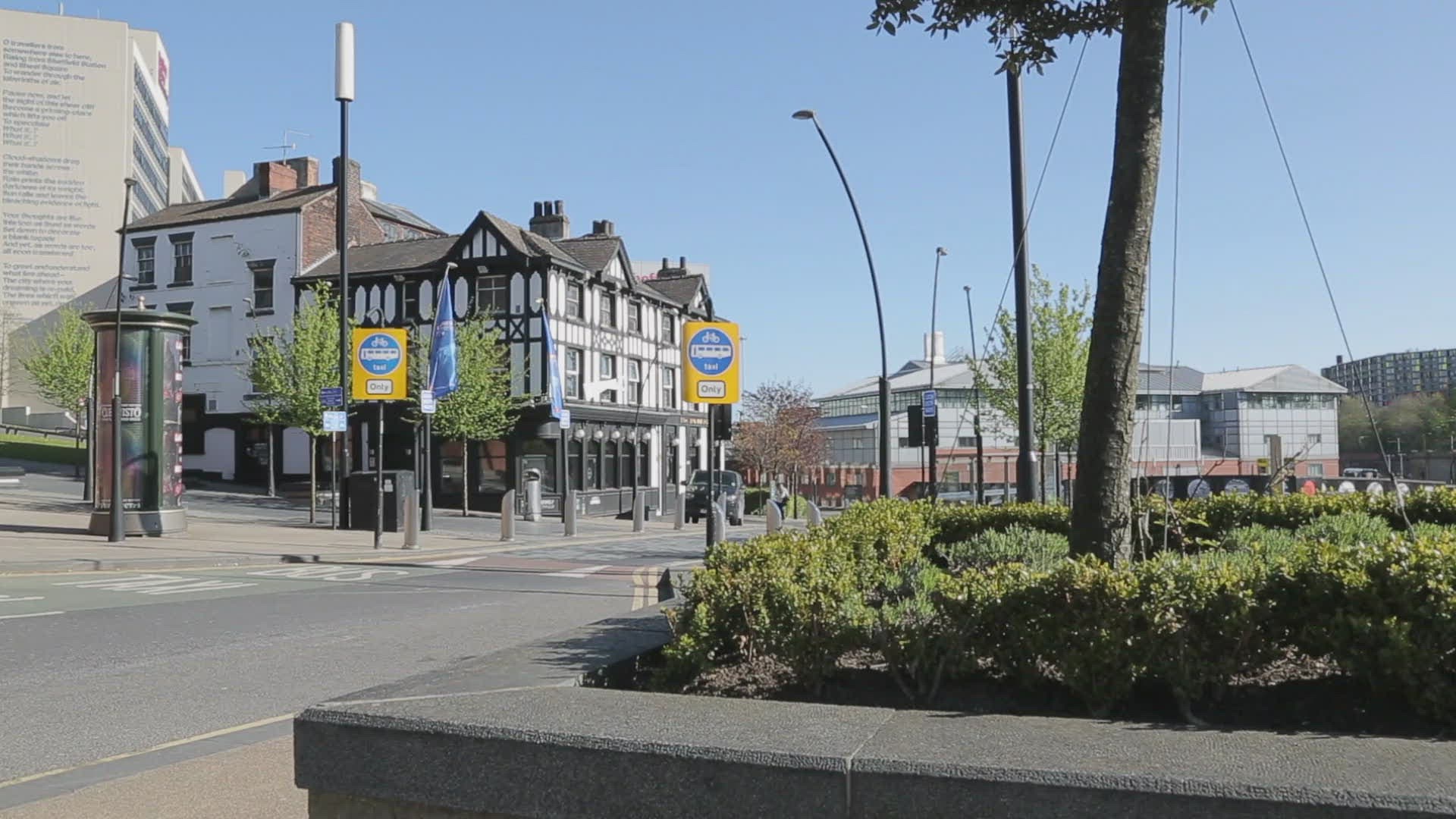 Reveal of Leeds city centre from the city centre Loop roundabout and John Lewis out to the whole cityscape.