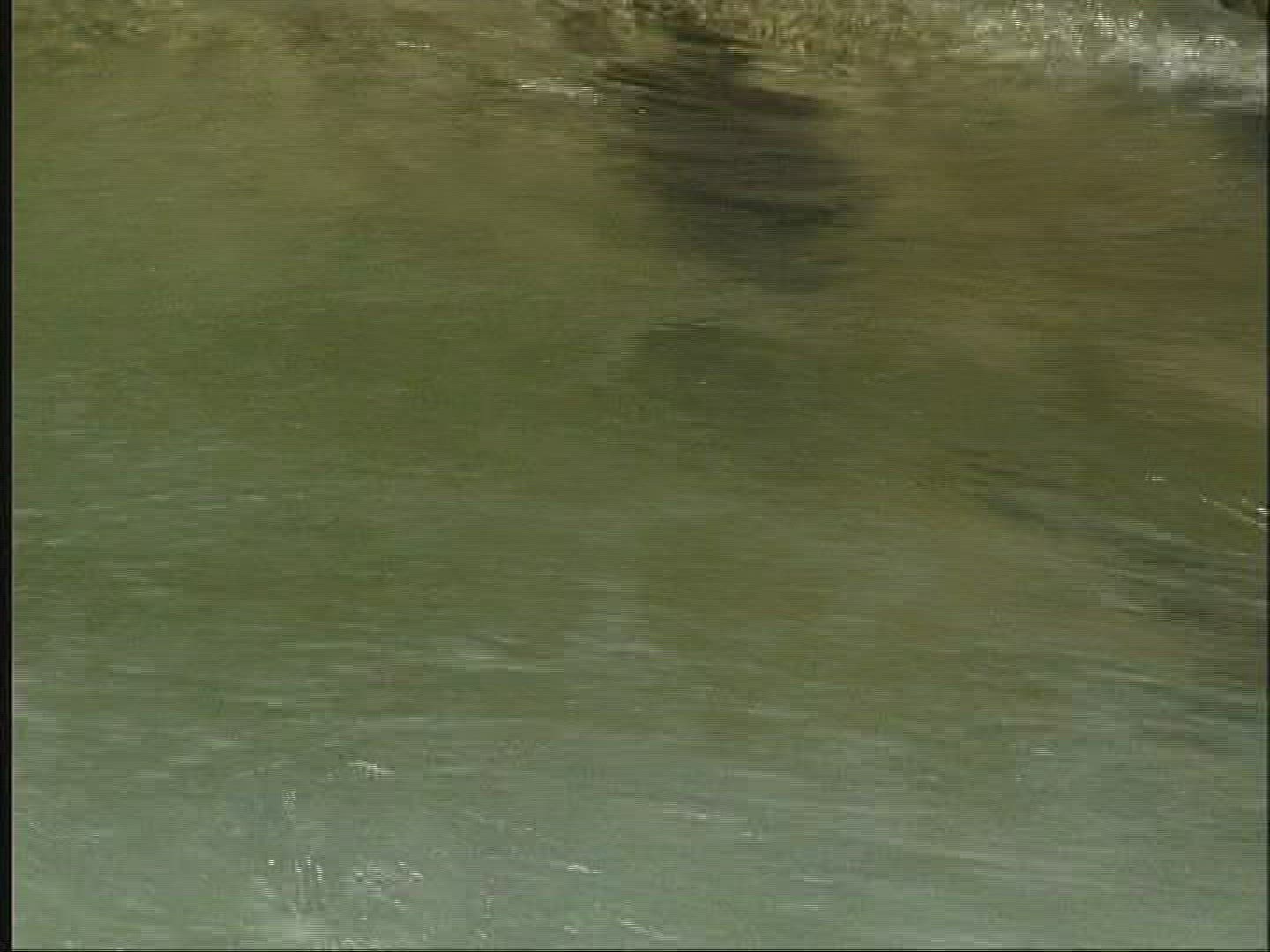 Drone shot flying upstream and revealing a dramatic background of tall mountains with whispy clouds.