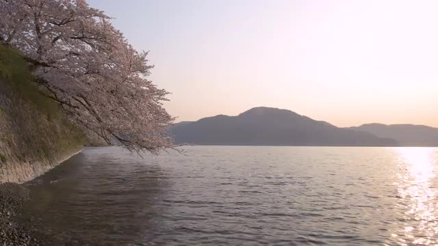 > Cherry blossoms in full bloom at sunrise at lake Biwa, Shiga Prefecture, Japan