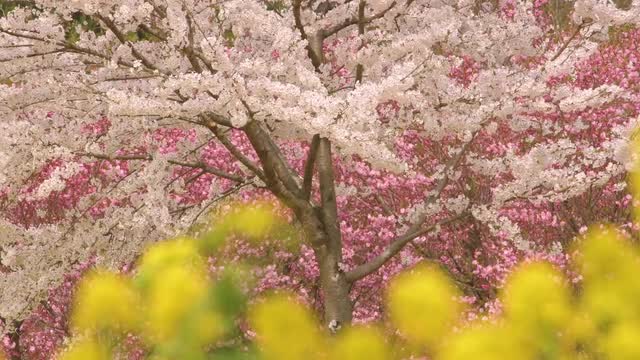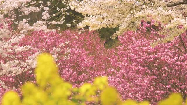 > Cherry blossoms and rapeseed flowers in full bloom, Gunma Prefecture, Japan