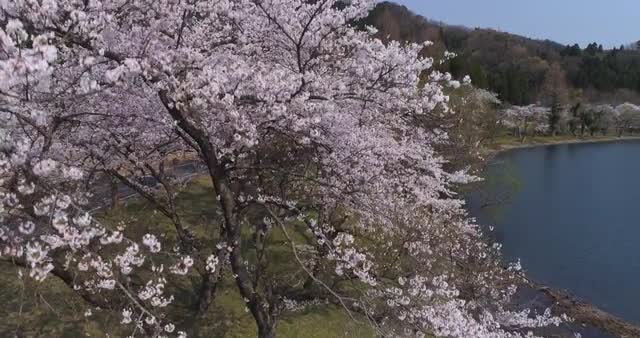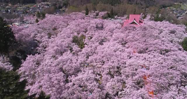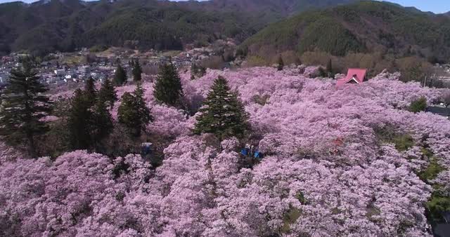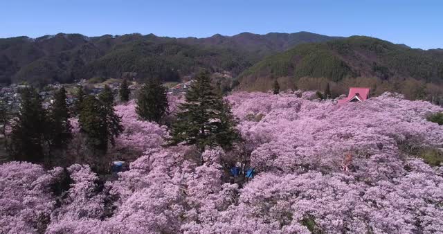 > Cinematic aerial footage of cherry blossoms in full bloom at Mount Yoshino, Nara Prefecture, Japan