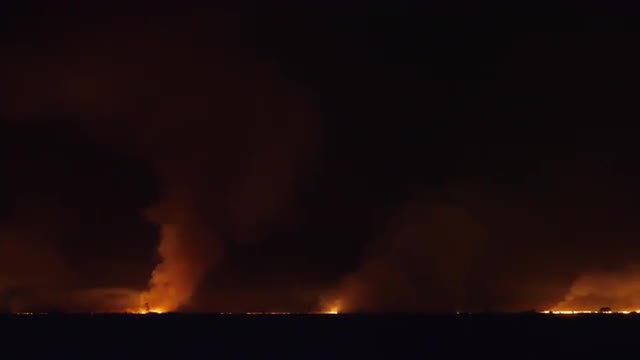 Pan Of The Grass Field Burns At Night