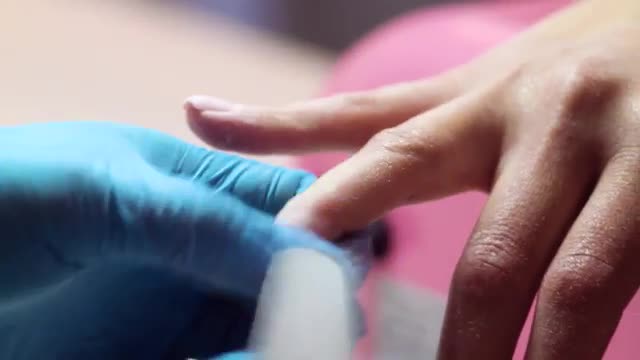 739330 - Hardware manicure in a salon. Manicurist is applying electric nail file drill