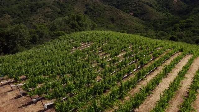 Aerial video of vineyard with subtle pans and tilts. Vineyard located in Mayacama Mountain Range north of Healdsburg, CA.