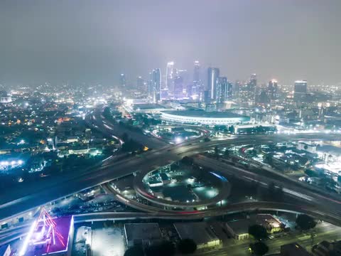 > Aerial drone time-lapse in motion (hyper lapse) at night with a cinematic fast moving traffic below.