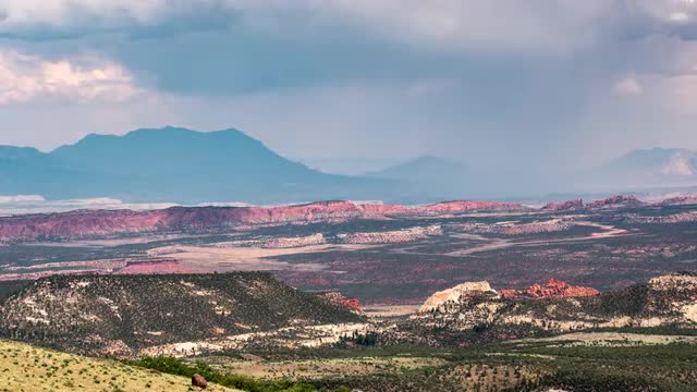 Wide view of desert landscape as storm moves through viewing Henry Mountains past Escalante and Capitol Reef Utah.