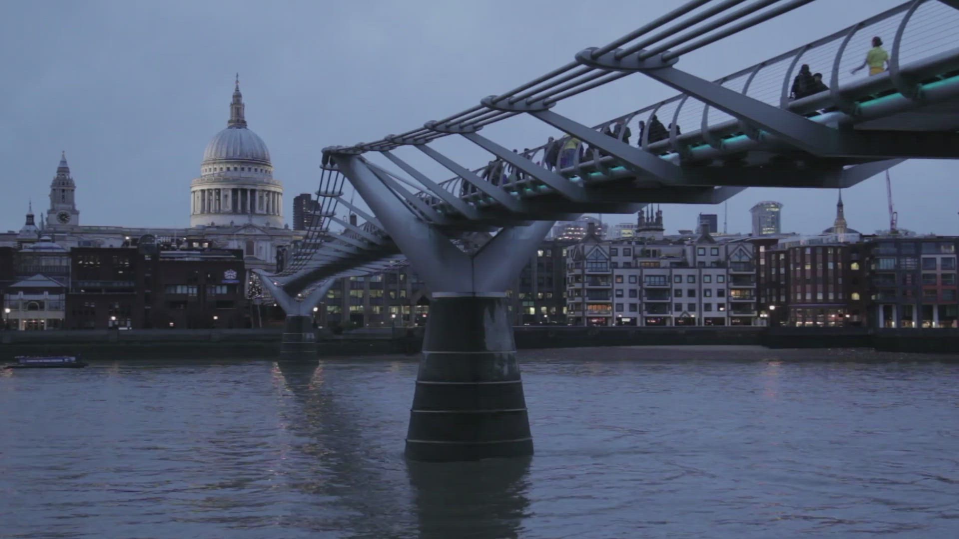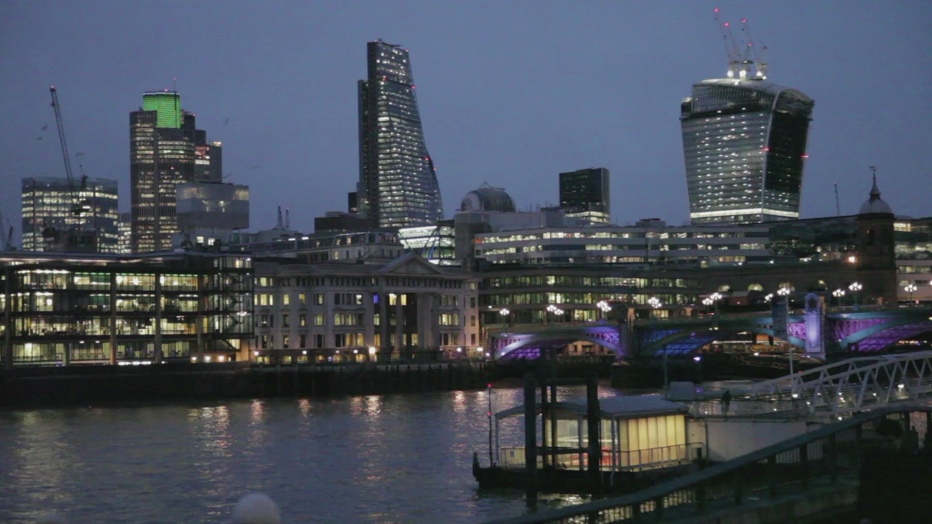 Several high rise buildings in London as seen through a gate, obscuring the view. Timelapse shot at twilight with a tracking move towards the gate. Slow shutter speed