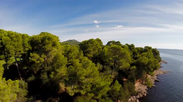 > aerial view. flying over coastline trees. green nature seascape