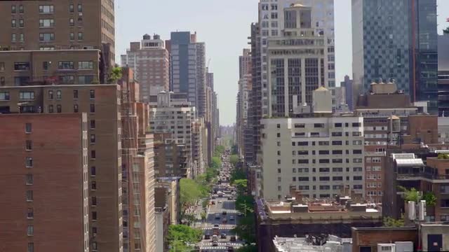 aerial view of new york city skyline at night sky. Shot on Red Epic.