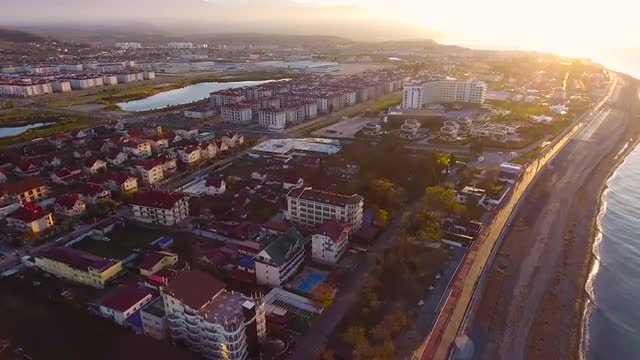 720579 - Aerial View. Flying over the city buildings houses sea near the beach on a sunny day. Sochi Adler o