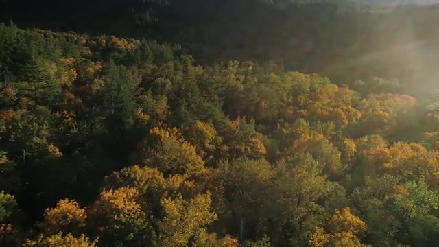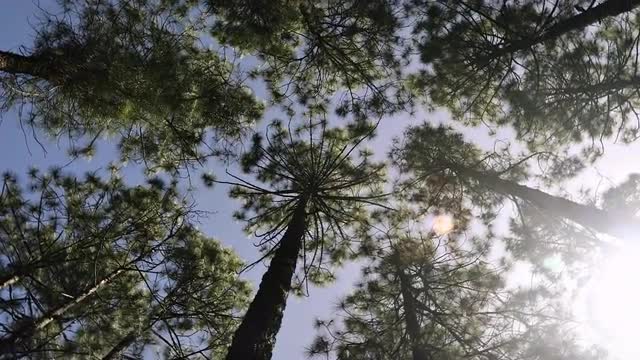 aerial shot looking up into forest canopy as the sun peaks through douglas fir and maple trees and flares on the lens.
