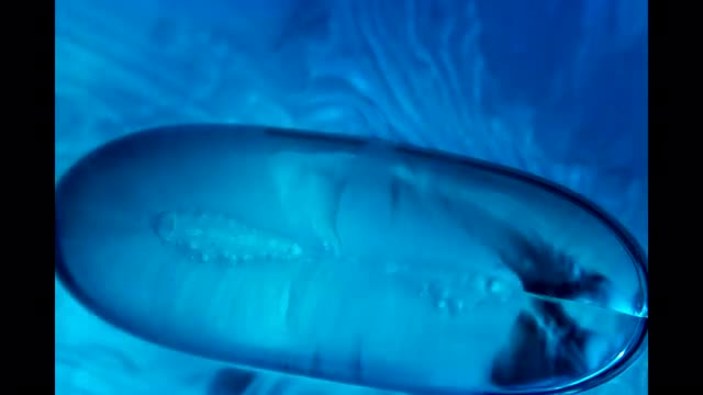 Close up of a pill dissolving in water while spinning. A sense of coldness is conveyed with the blue canvas.