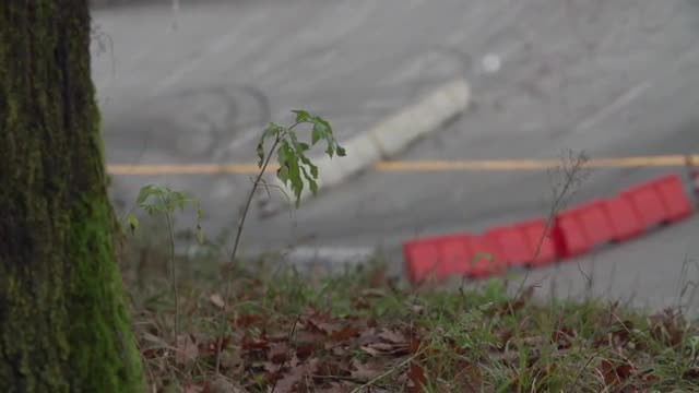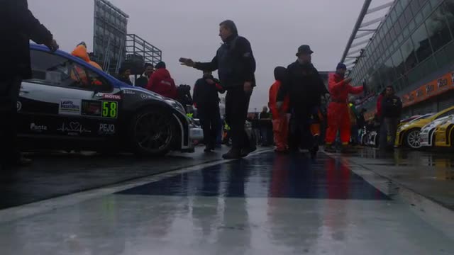 Rally cars guided back to paddock by workers as the camera pans along a dolly.