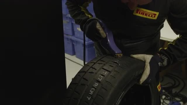 Mechanic uses tool to carve tread into a tire in preparation for rain racing.