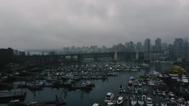 1129955 - Establishing aerial view of Burrard Bridge with the West Vancouver on the background. Jib down movem