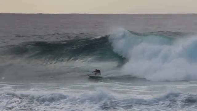 Surfer gets a big wave and a couple of nice turns before bailing before the crash.