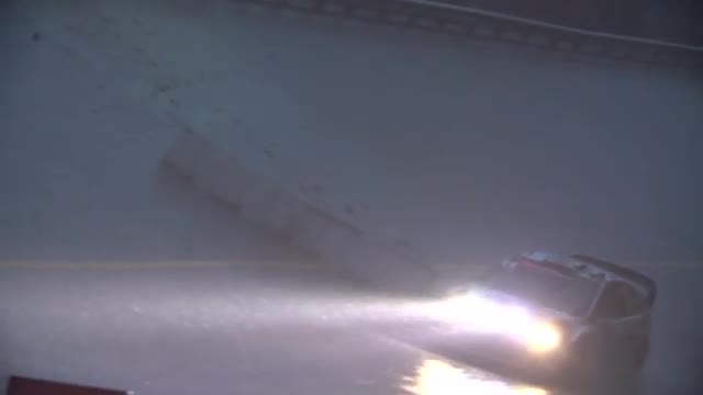 Rally Driver Racing Through Obstacles in Rain Towards Cam